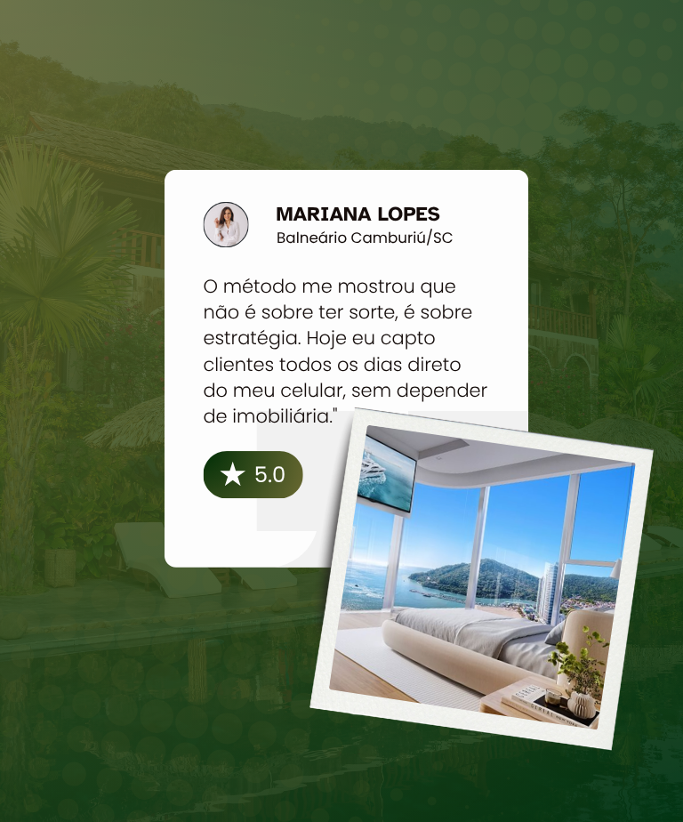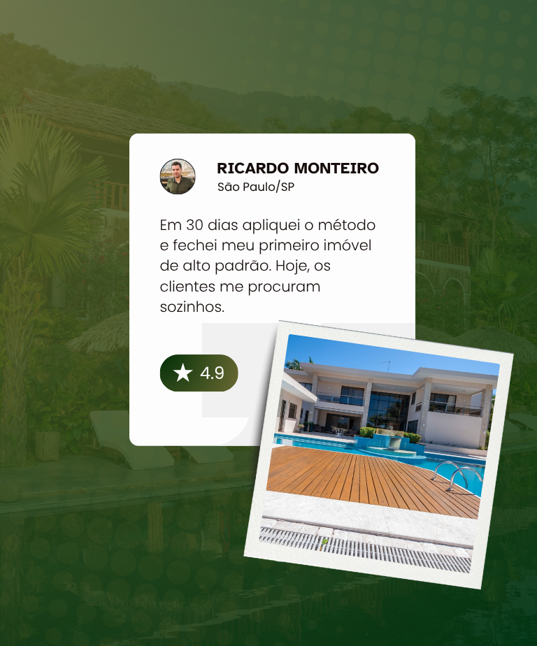É um programa de aceleração prática para corretores que querem dominar o mercado de imóveis de alto padrão usando apenas o celular e a internet. O método ensina passo a passo como gerar autoridade, atrair clientes de alto valor e transformar negociações comuns em vendas de seis dígitos — mesmo que você ainda não tenha experiência com imóveis de luxo.